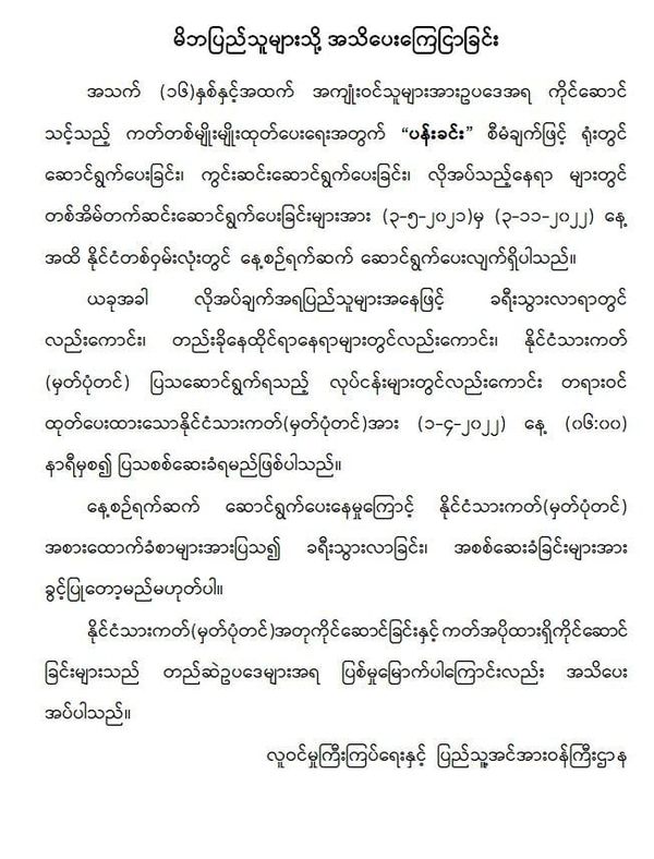 缅甸军事委员会宣布,自4月1日起民众将不得凭证明信出行。军事委员会的声明中表示,自4月1日起,民众出行和住宿将要求出示公民身份证,不再允许使用证明信。