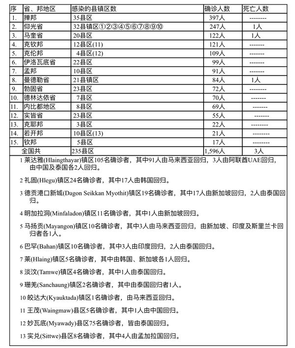 全国15个省、邦地区都有众多的确诊人数,其中有10多个省邦地区确诊人数在百人以上或接近百人,可见疫情蔓延的严重性。单日死亡人数达到3人,分别为来自仰光省打基达(Thaketa)镇区、马奎省南卯(Natmauk)县区及曼德勒省阿马拉普拉(Amarapura)县区等各1人。