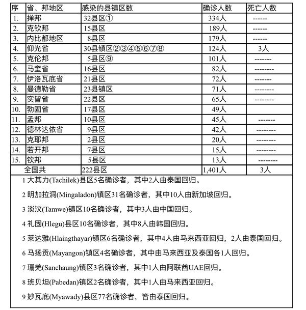 缅甸卫生部于3月9日下午6时发布公告,全国各省邦,3月8日的确诊人数共为1,401人,死亡人数3人,具体数据如下表: