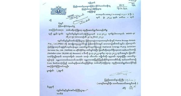 缅甸军事委员会已下达通知书指示缅甸警察部队,为运送航空燃油至曼德勒国际机场的油罐车提供安全保护。