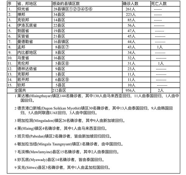 缅甸卫生部于3月12日下午6时发布公告,全国各省邦,3月11日的确诊人数共为956人,死亡人数2人,具体数据如下表: