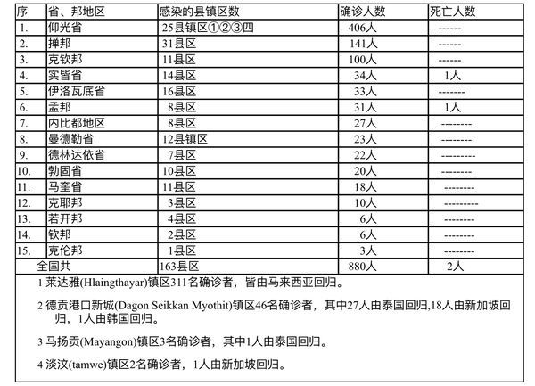 全国15个省、邦地区中,现在已有12个省、邦的确诊人数跌到40人以下。单日死亡人数2人,分别来自实皆省的瑞帽(Shwebo)县区及孟邦穆洞(Mudon)县区各1人。