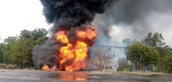 缅甸勃固省一油罐车倾覆起火 大火蔓延至附近民居