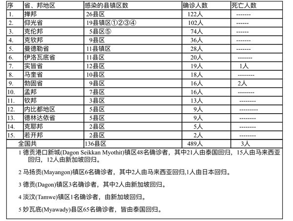 缅甸卫生部于3月17日下午6时发布公告,全国各省邦,3月16日的确诊人数共为489人,死亡人数3人,具体数据如下表: