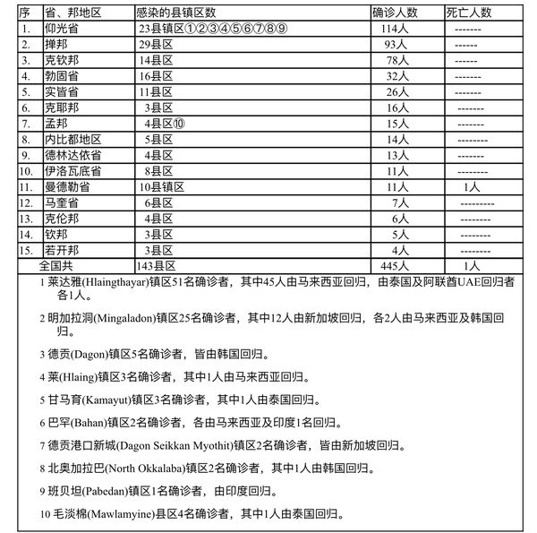 缅甸卫生部于3月18日下午6时发布公告,全国各省邦,3月17日的确诊人数共为445人,死亡人数1人,具体数据如下表: