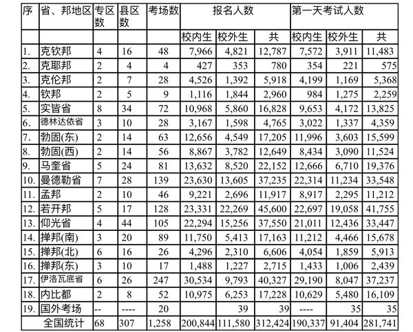 根据缅文《镜报》4月1日的报导,今年全国各省邦地区参加此会考的学生人数如下表: