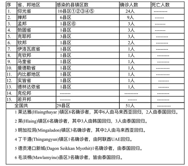 缅甸卫生部于4月5日下午6时发布公告,全国各省邦,4月4日的确诊人数共为51人,无死亡人数,具体数据如下表: