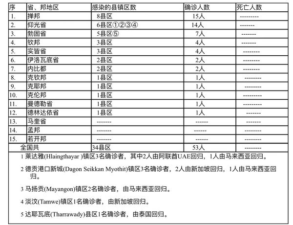 缅甸卫生部于4月8日下午6时发布公告,全国各省邦,4月7日的确诊人数共为53人,无死亡人数,具体数据如下表: