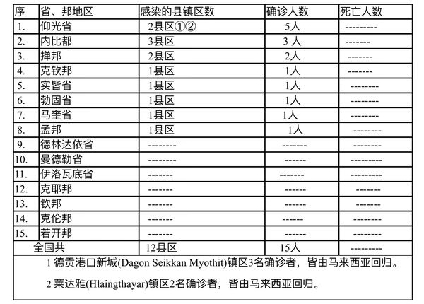 缅甸卫生部于4月2 7日下午4时发布公告,全国各省邦,4月26日的确诊人数共为15人,无死亡人数,具体数据如下表: