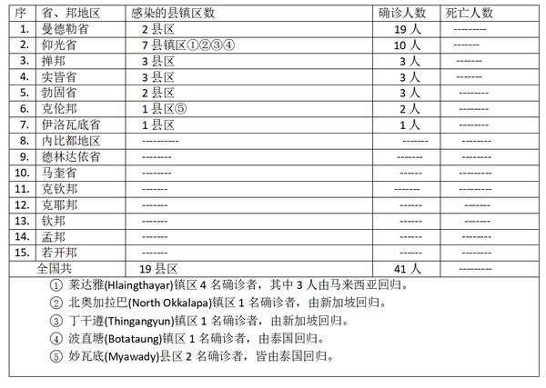 缅甸卫生部于4月2 9日下午4时发布公告,全国各省邦,4月28日的确诊人数共41人,无死亡人数,具体数据如下表: