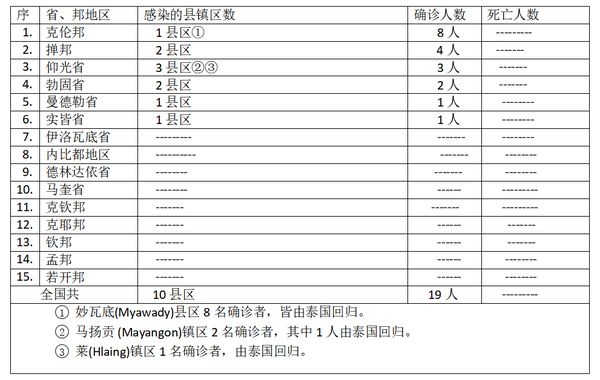缅甸卫生部于5月1日下午4时发布公告,全国各省邦,4月30日的确诊人数共19人,无死亡人数,具体数据如下表: