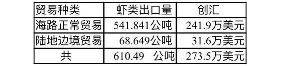 2022—23财政年度,自4月1日至4月30日的一个月时间内,缅甸向国外出口虾类,由正常的海路贸易管道出口541.841公吨,创汇美元241.9万美元。而由陆地边境贸易出口68.649公吨,创汇美元31.6万美元。故这个月期间虾类总共出口610.49公吨,创汇共为273。5万美元。