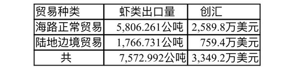 在刚刚过去的2021—22年度的财政过渡期中,由海路正常贸易出口虾类5,806.261公吨,创汇2,589.8万美元;由边境贸易出口1,766.731公吨,创汇759.4万美元。故这一段时期虾类的总出口为7,572.992公吨,总创汇为3,349.2万美元。