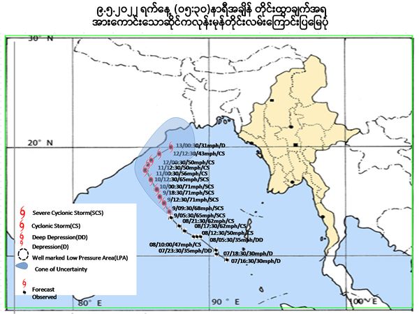 据气象与水文局于5月9日上午发表的通知,强飓风阿萨尼目前位于哥哥遵镇(Coco Island)西南偏西约360海里及海基遵(Hainggyikyun)西南偏西约 445 海里处。目前,该飓风没有向缅甸方向移动。因此,预警级别为黄色。