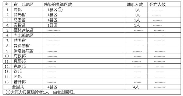 缅甸卫生部于5月17日下午4时发布公告,全国各省邦,5月16日的确诊人数共4人,无死亡人数,具体数据如下表: