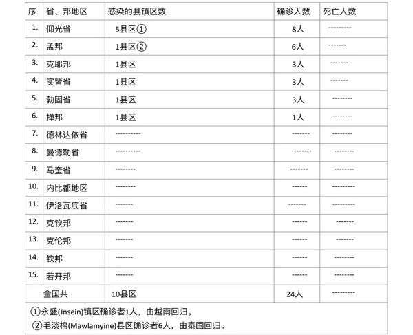 缅甸卫生部于5月18日下午4时发布公告,全国各省邦,5月17日的确诊人数共24人,无死亡人数,具体数据如下表: