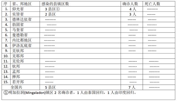 缅甸卫生部于6月3日下午4时发布公告,全国各省邦,6月2日的确诊人数共7人,无死亡人数,具体数据如下表: