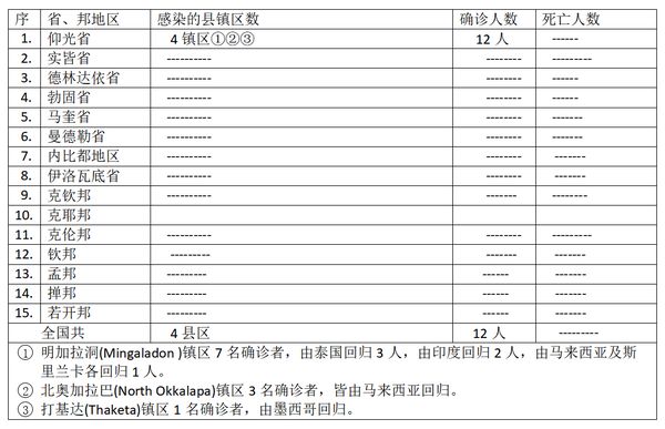 缅甸卫生部于6月28日下午4时发布公告,全国各省邦,6月27日的确诊人数12人,无死亡人数,具体数据如下表: