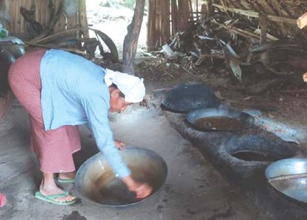 要想得到1缅斤的棕榈糖,需将装满棕榈汁水的5罐棕榈汁竹筒进行炼制,当地的一罐棕榈汁竹筒容量为2公升。去年雌株棕榈树炼糖季节时棕榈糖价为1缅斤1600缅元,今年的开价为1缅斤1,800缅元,以此价钱出售给有关需求者。