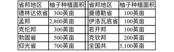 按:柚子也是一较著名 热带水果之一,根据此报上所说的数据,缅甸各省邦栽种的柚子面积如下表: