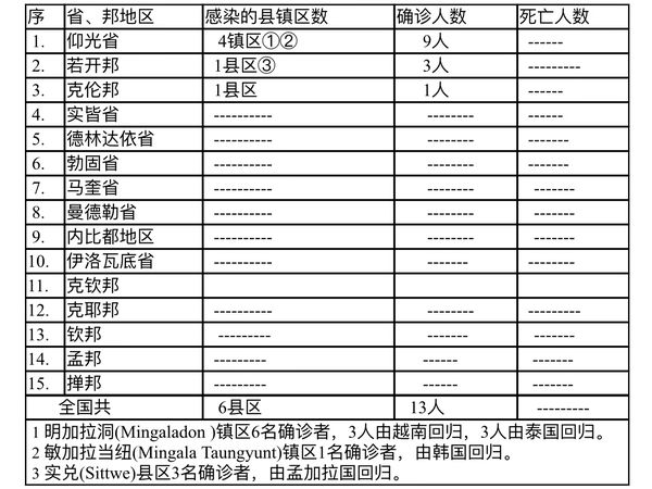 缅甸卫生部于7月6日下午4时发布公告,全国各省邦,7月5日的确诊人数13人,无死亡人数,具体数据如下表: