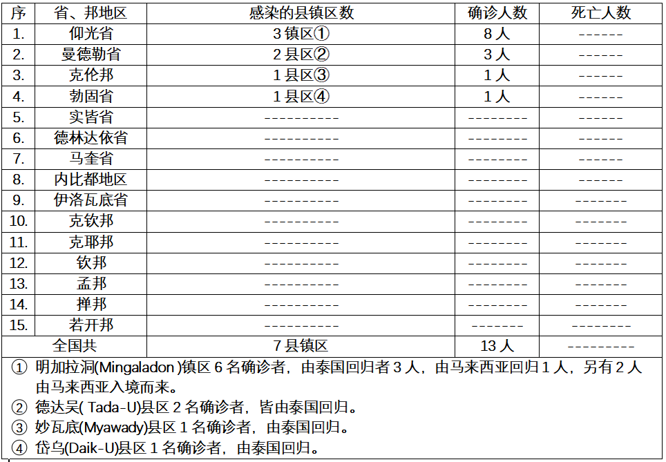 缅甸卫生部于7月14日下午4时发布公告,全国各省邦,7月13日的确诊人数13人,无死亡人数,具体数据如下表: