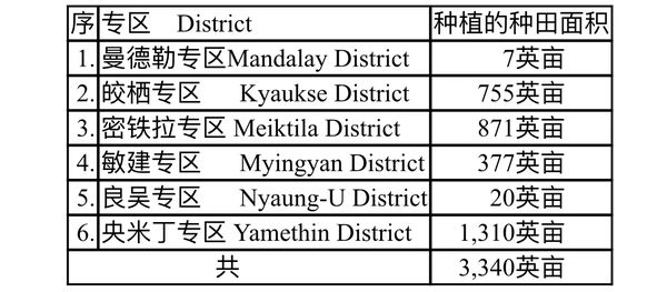 长纤维棉花种田3,340英亩规划在省内6个专区内种植,各专区的种田面积分别为:曼德勒专区7英亩,皎栖(Kyaukse)专区755英亩,密铁拉(Meiktila)专区871英亩,敏建(Myingyan)专区377英亩,良吴(Nyaung-U)专区20英亩,央米丁(Yamethin)专区1,310英亩,共3,340英亩的种田。对种植这些种田的农夫们,将免费赞助有关种籽及农药。