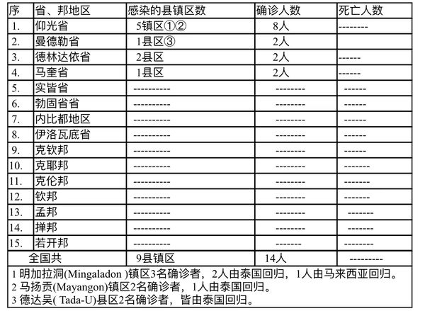 缅甸卫生部于7月16下午4时发布公告,全国各省邦,7月15日的确诊人数14人,无死亡人数,具体数据如下表: