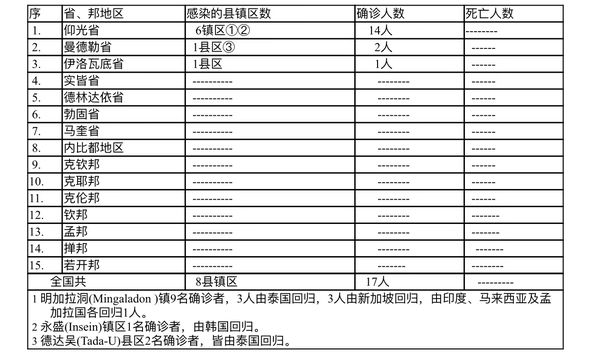 缅甸卫生部于7月20下午4时发布公告,全国各省邦,7月19日的确诊人数17人,无死亡人数,具体数据如下表: