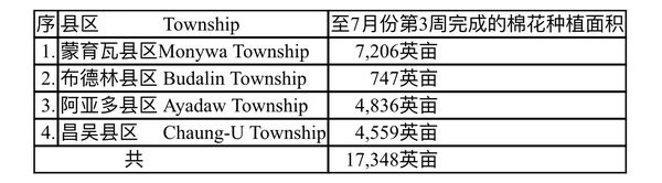 “蒙育瓦专区直到7月份的第3周共种植了各种品种棉花17,000多英亩。为了使棉农们在进行种植工作时能遵守良好的农业种植习俗GAP规划,农业局职工们帮助这些棉农们选择良种种籽,为提高产量而与棉农们紧密合作。”实皆省农业局副局长U Aung Kyi Win如是说道。