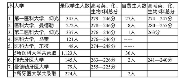 医科大学是缅甸各大专院校中最“热门”的大学,许多高考生都以考入此大学作为自己的第一志愿。今年该大学的录取工作有了一些变化。首先是以高考分数作为录取标准时,只看英文、化学、生物这3科的分数,而不是看高考总分数。第二是被录取的学生都要进行面试(口试),今年这面试工作于9月间在内比都进行(见《缅华网》今年9月12日“缅甸教育”栏目中的有关报导),必须参加这面试的学生为医科大学及牙医大学的学生(其他大学的学生还不用参加这面试)。第三是这医科大学、牙医大学今年有自费生制度。自费生录取标准没有什么特别之处,还是以高考成绩为准,而且也没有因为是“自费”而降低录取分数线。据悉唯一差别是自费生不用签字说毕业后要“为国家服务”,以往医科大学学生在入学时都要签字表示至少为国家“服务3年”,现在再重新强调这一点,不愿意者可声明自费上学。,不过自费生们的学费听说十分高昂,有说是每年上百万元缅币,有说不止这个数目,实际情况只有当事者本身会知晓了。