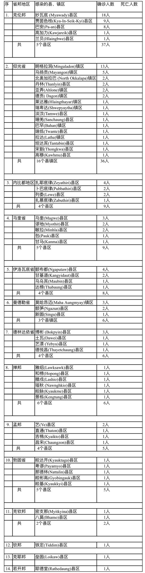 确诊者132人,来自14个省邦地区的61个县镇区。确诊者中有18名国外回归者(皆由泰国回归)。国内确诊者114人中仰光省占36人(约为32%的比例),各省邦的国内确诊人员约为仰光省的2倍多。各省邦国内 确诊人员78人中,克伦邦国内确诊者19人(该邦另有18名从国外回归的确诊人员),内比都及马奎省各9人,伊洛瓦底省8人,曼德勒省、德林达依省及掸邦各6人,孟邦及勃固省各5人,克钦邦2人,钦邦、克耶邦及若开邦各1人。