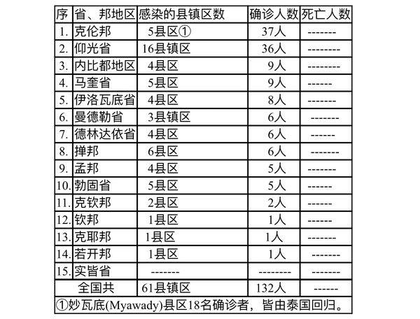缅甸卫生部于11月3日下午4时发布公告,全国各省邦,11月2日的确诊人数132人,无死亡人数,具体数据如下表: