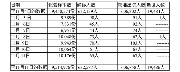 缅甸卫生部2022年11月5日至11月11日每晚8时所公布的疫情情况分别如下: