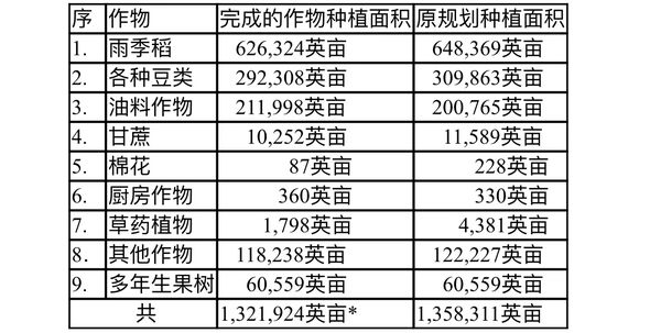 (*注:报上报导说完成的种植面积为1,323,919英亩,这里计算结果是1,321,924英亩。些微差错,不知是何处的数据弄错。)