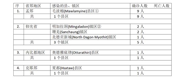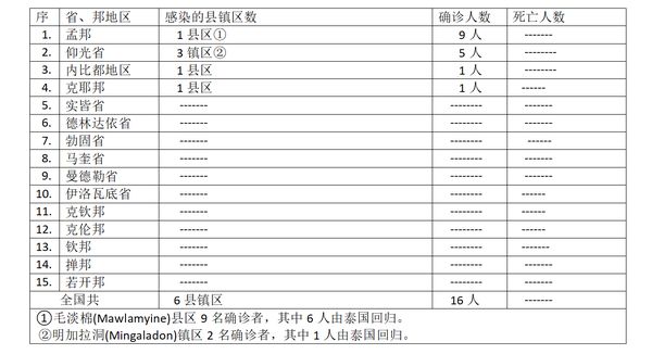 确诊者16人,来自4个省邦地区6个县镇区。国内确诊者仅有9人,其中仰光省占4人(不到 ½ 的比例,仰光省另有1名确诊者为国外回归者),各省邦的国内确诊人员与仰光省相差不多。各省邦国内确诊人员5人中,孟邦国内确诊者3人,内比都地区及克耶邦各1人。