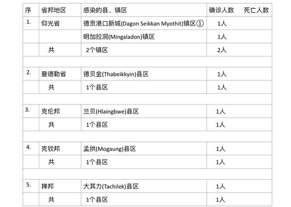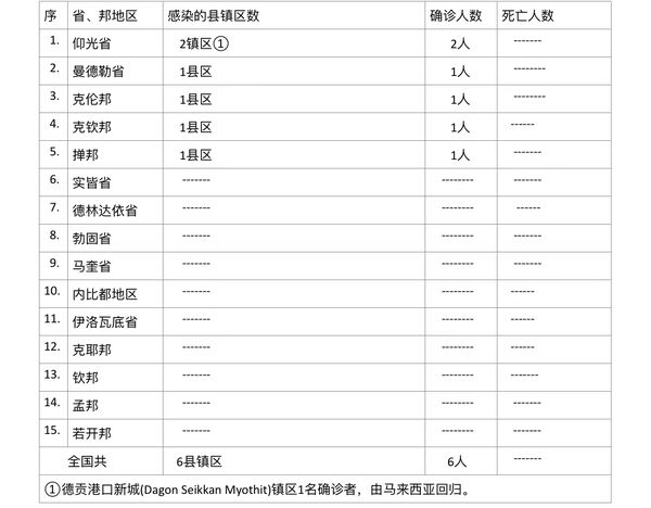 缅甸卫生部于12月6日下午4时发布公告,全国各省邦,12月5日的确诊人数6人无死亡人员,具体数据如下表: