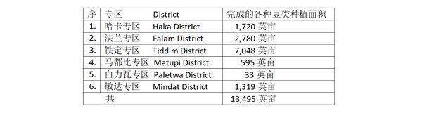 哈卡(Haka)、法兰(Falam)、铁定(Tiddim)、马都比(Matupi)、白力瓦(Paletwa)及敏达(Mindat) 6个专区内,自2022年4月间开始这豆类的种植工作,共种植了各种豆类13,495英亩。