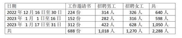 接着在1月17日至31日期间经过审查后回复外交部的工作邀请书有312份,这些邀请书招聘男工422人、女工628人共1,050人。