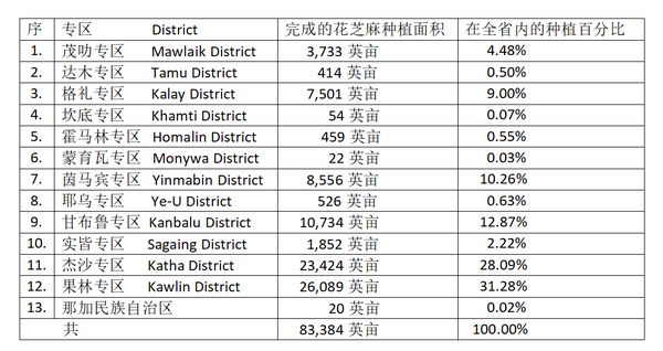 在2022—23财政年度冬作物种植季节时期,实皆省12各专区及那加(Naga)民族自治区的各县区内,原规划种植油料作物花芝麻75,000英亩,实际种植时,在种植季节结束时共种植了花芝麻83,384英亩超额完成了原规划的种植面积,多种植了该花芝麻8,384英亩。
