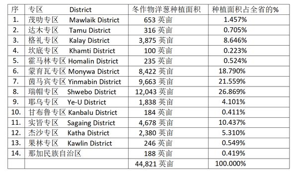 检测各专区的洋葱种植面积,会发现瑞帽专区种植量最多,其洋葱种植面积占全省种植面积的 ¼ 以上。茵马宾专区种植面积次之,占全省种植面积的五分之一以上。蒙育瓦专区种植面积位居第三,其种植面积占全省的六分之一以上。这三个专区的种植面积就占了全省种植面积的三分之二以上了,种植面积分别在8,000英亩以上、9,000英亩以上及12,000英亩以上。其余各专区种植面积都在5,000英亩以下了。其中好几个专区的种植面积都是几百英亩而已,真是“屈指可数”了。