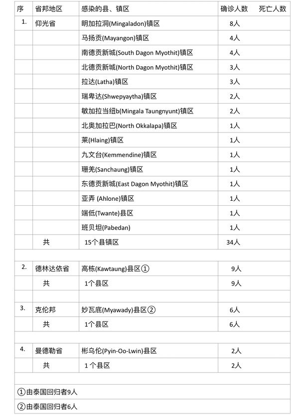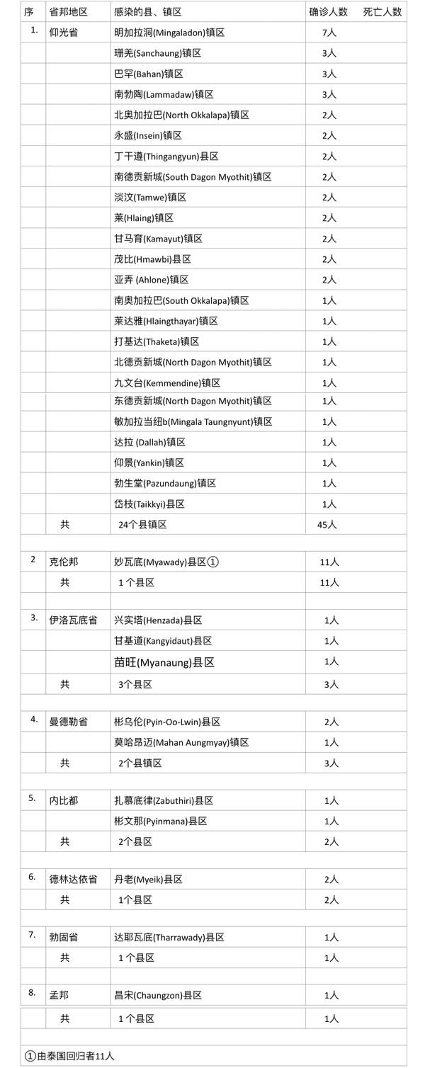 缅甸卫生部于4月24日下午4时发布公告,全国各省邦,4月23日的确诊人数为45人,无死亡人数,具体数据如下表: