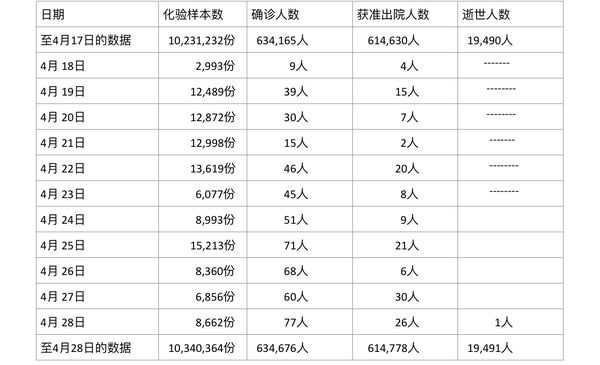 这11天内单日确诊人员除了4月18日以外都是在两位数以上,而死亡人员也在4月28日出现了,虽说只有1人,但说明“死人的事情还是会发生的”,对疫情还是不能放松警惕性,一些医务人员这样说道。