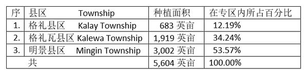 专区内的3个县区中,以明景县区种植的冬绿豆面积为最多,占了全专区种植面积的一半以上比例,其次是格礼瓦县区,该县区冬绿豆种植面积占全专区三分之一以上比例。