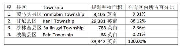据7月9日出版的《苗瓦底日报》英文版报导,实皆省茵马宾(Yinmabin)专区将在今年雨季种植油料作物雨花生33,000多英亩,这是由该茵马宾专区农业局方面获知的数据资料。专区内各县区规划的种植面积如下表: