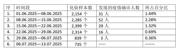 卫生部于7月14日晚上8点发出公告,在7月6日晚上8点是直到7月13日晚上8时这一周时间内,对735个化验样本进行检测,没有发现任何新冠疫情确诊者。