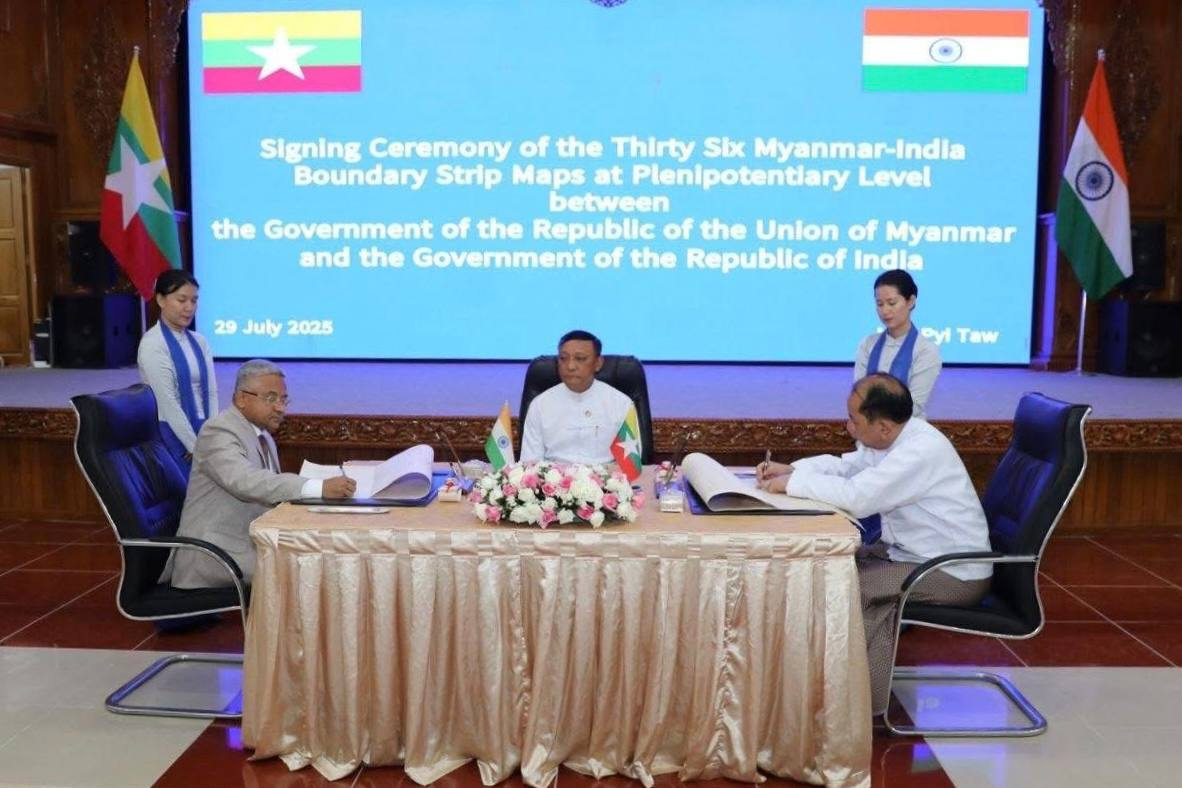 随后,在缅甸外交部副部长吴哥哥觉(ဦးကိုကိုကျော်)的见证下,缅甸外交部常务秘书豪坎松( ဦးဟောက်ခန့်ဆုမ်း)与印度驻缅甸大使阿巴伊·塔库尔共同签署了缅印边界地图36幅确认文件。通过对边界地图的正式确认,缅印两国将进一步提升边界管理合作效率,推动双边关系向更加稳固的方向发展