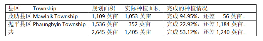 在现2025—26财政年度雨作物种植季节期间,茂叻专区内的2个县区,茂叻县区及抛平(Phaungbyin)县区共规划种植这雨蔬菜作物2,645英亩,如今已种植了此蔬菜作物1,405英亩,完成规划面积53.12%的种植工作。各县区规划的种植面积及所完成的种植面积如下表: