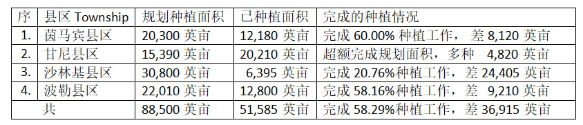 四个县区中,以沙林基规划种植面积为最多,而在目前完成的种植面积中,以甘尼县区为最多,该县区目前就已超额完成规划种植面积了。