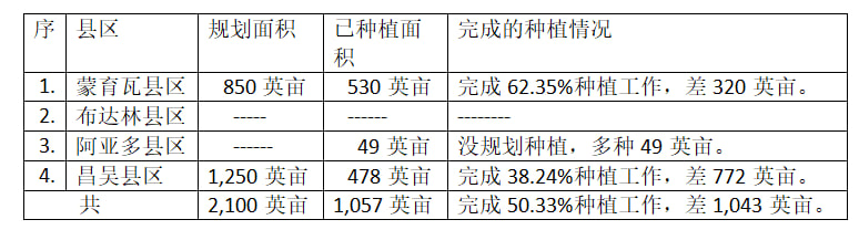 蒙育瓦专区内的四个县区:蒙育瓦县区、布达林(Budalin)县区、阿亚多(Ayadaw)县区及昌吴(Chaung-U)县区在现在的雨季期间规划种植的黑麦豆种植面积及目前完成的种植面积如下表:
